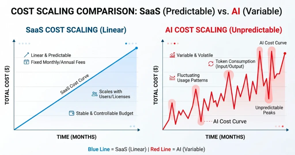 Treating a generative AI deployment like a standard SaaS subscription is a fatal error. SaaS pricing is predictable and scales linearly with users. AI costs fluctuate wildly based on prompt complexity, retries, and output tokens.