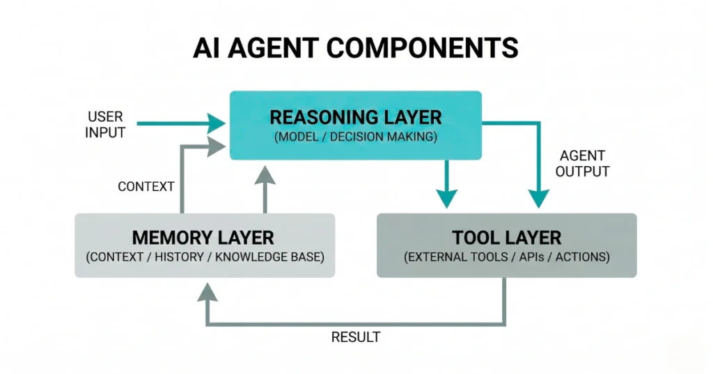 There’s a reasoning layer (the model), which decides what to do next. There’s some form of memory, which keeps track of context beyond a single message. And there’s a tool layer, which is where actual execution happens.