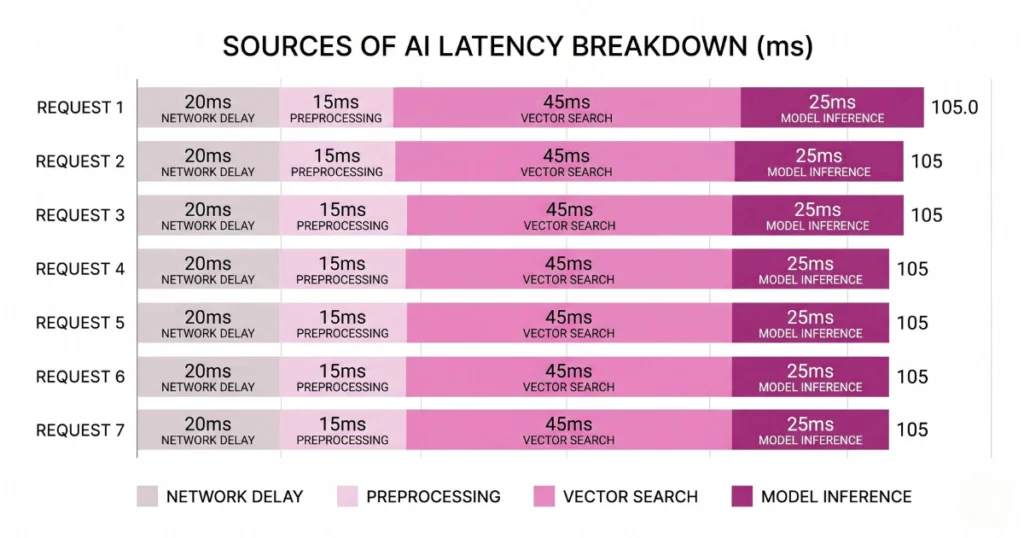 Most latency problems have nothing to do with the model. They come from everything around it. Common culprits include slow vector database queries, multiple API hops across regions, and cold starts in serverless functions.
