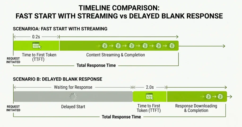 If your app takes 8 seconds total but starts responding in 500ms, users are fine. If nothing shows for 3 seconds, they assume it’s broken. As a practical rule, if TTFT exceeds ~800ms, users feel lag. Fix your TTFT first. Always.