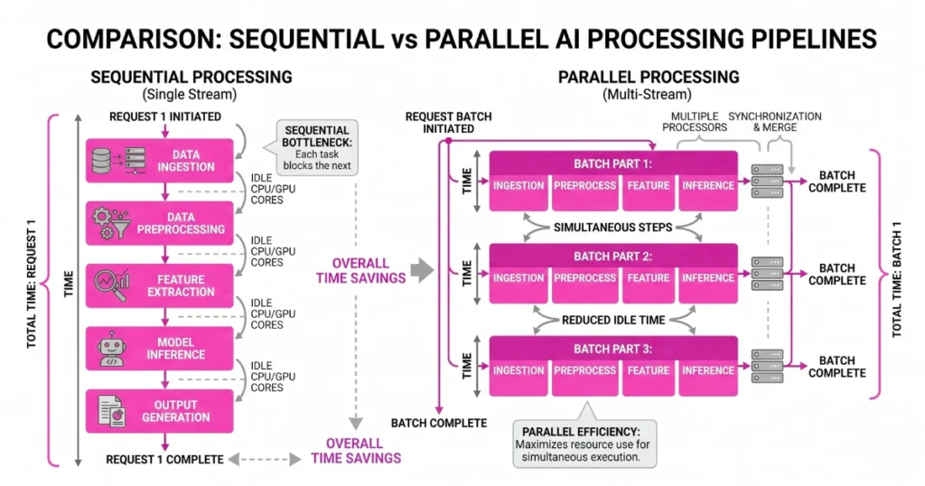 A lot of pipelines are unnecessarily sequential. Processing input, running safety checks, fetching data, and calling the model happen one after the other. Each step waits for the previous one.