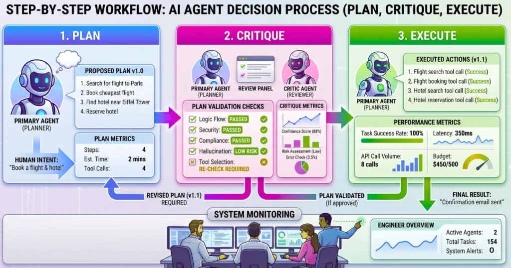 Designing a “Plan -> Critique -> Execute” loop is mandatory for high-stakes workflows. A secondary critic agent must double-check the primary agent’s logic against user constraints before firing irreversible functions. This introduces latency but drastically reduces destructive errors.